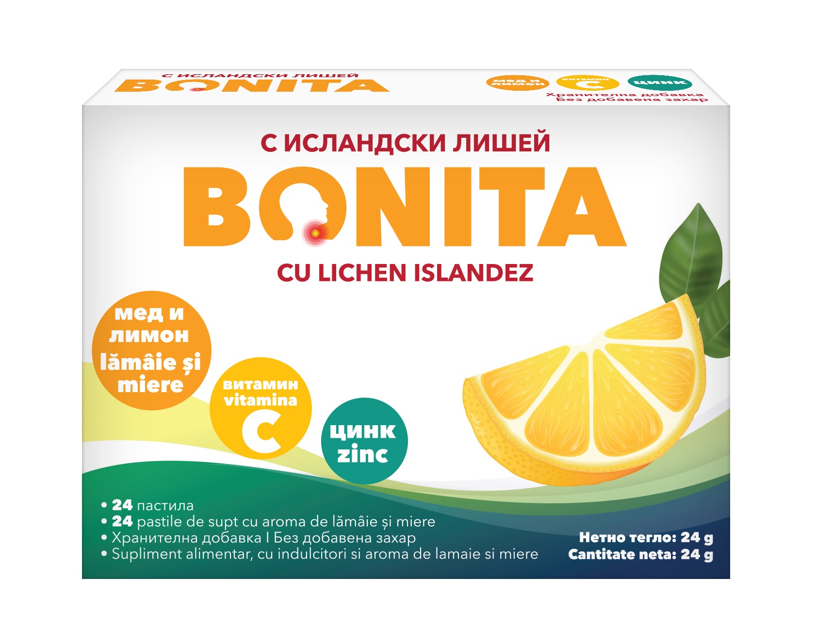 БОНИТА Мед и лимон е хранителна добавка без добавена захар, под формата на пастили с вкус на мед и лимон, предназначени за възрастни и деца над 10 годишна възраст .