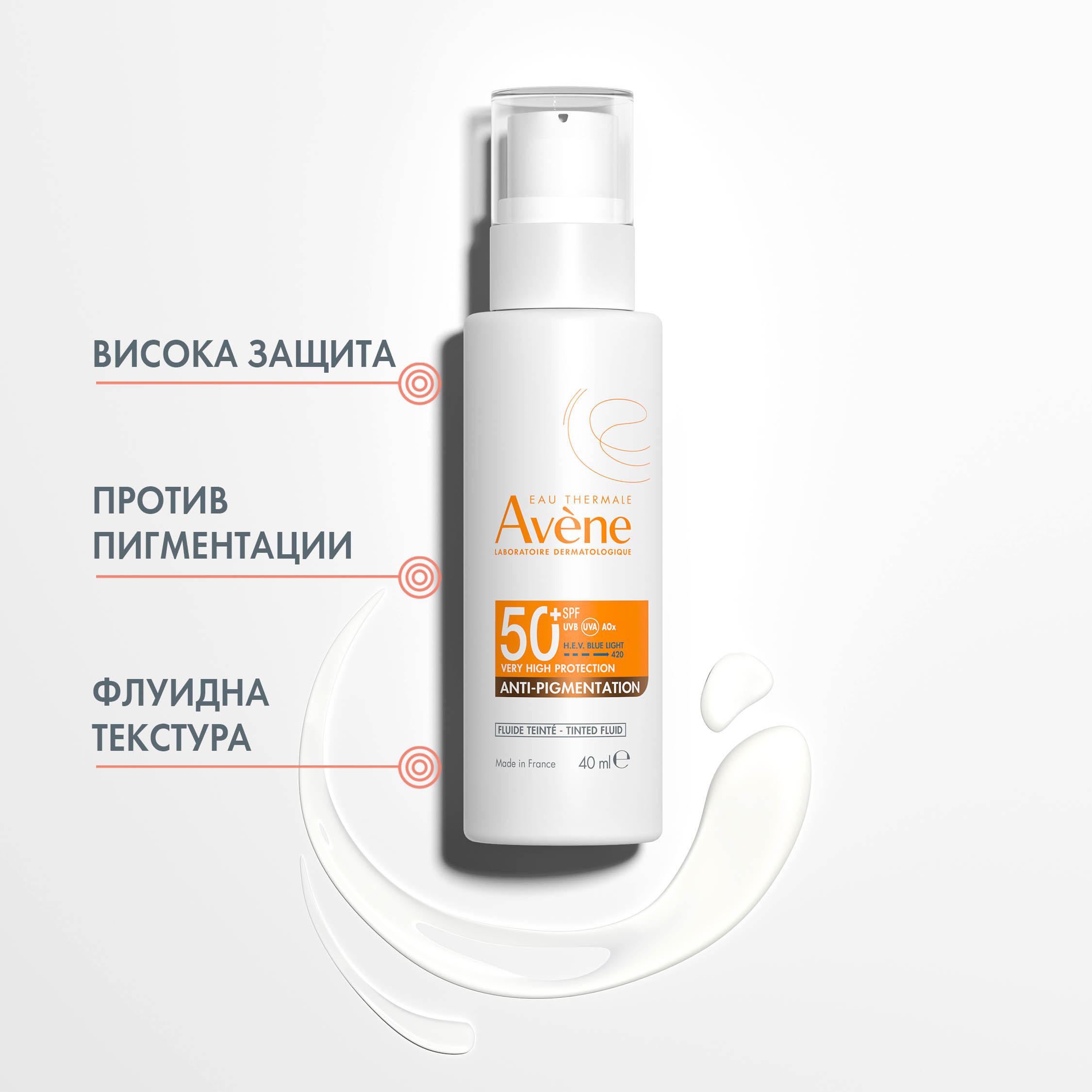 Флуидът против пигментни петна SPF50+ осигурява висока ежедневна защита срещу UVB, UVA и HEV синя светлина, за да предотврати фотоиндуцирани пигментни петна