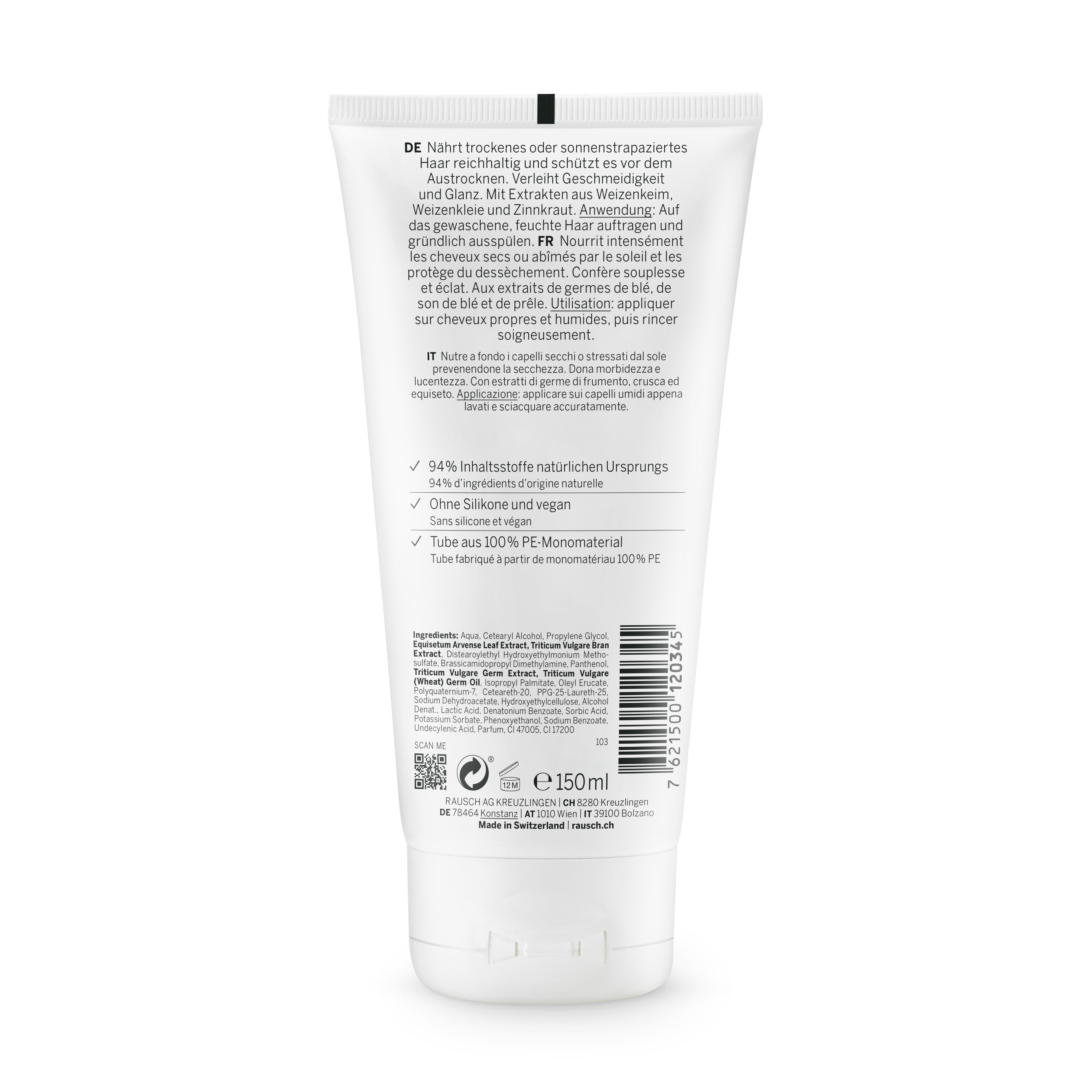 RAUSCH балсам за суха коса с пшеничен зародиш - с отмиване 150ml За увредена коса склонна към накъсване. Придава устойчивост и блясък на увредената коса. Възстановява структурата на косъма и увеличава неговата еластичностност.
