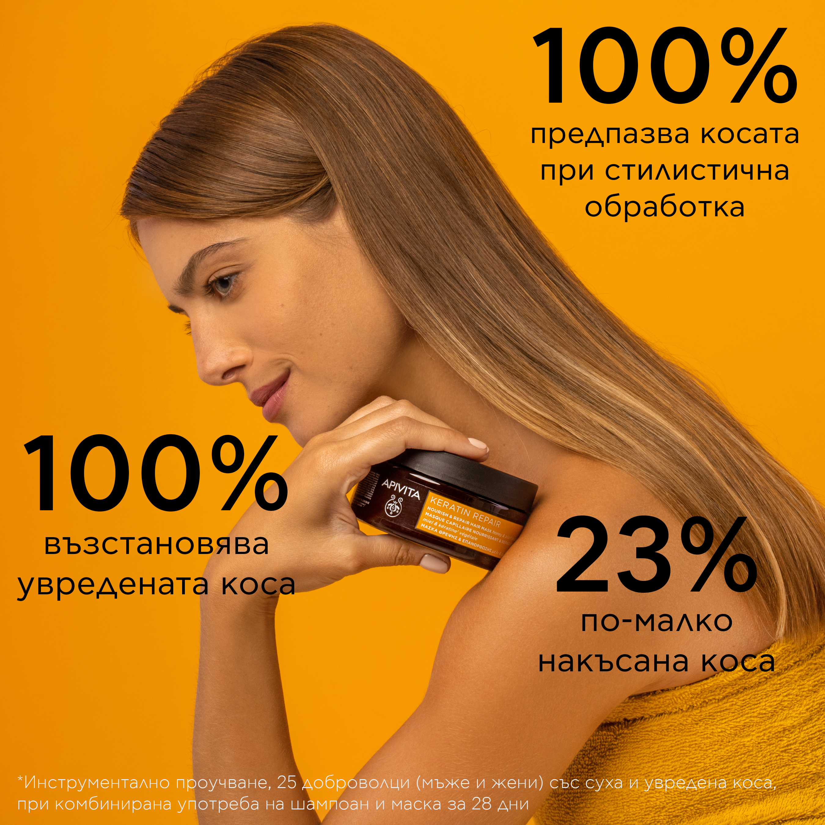 Маската за коса възстановява естествения блясък и жизнеността на косата, благодарение на комбинацията от 5 витамина и укрепващите етерични масла от портокал, лимон и грейпфрут, които й придават изумителна мекота и виталност. Богата на мед от мащерка и масло от органична маслина, тя подхранва косата в дълбочина. Специално създадения APISHIELD HS комплекс реструктурира фибрите на косата, защитавайки я от външни агресивни влияния (замърсяване и стилистична обработка).