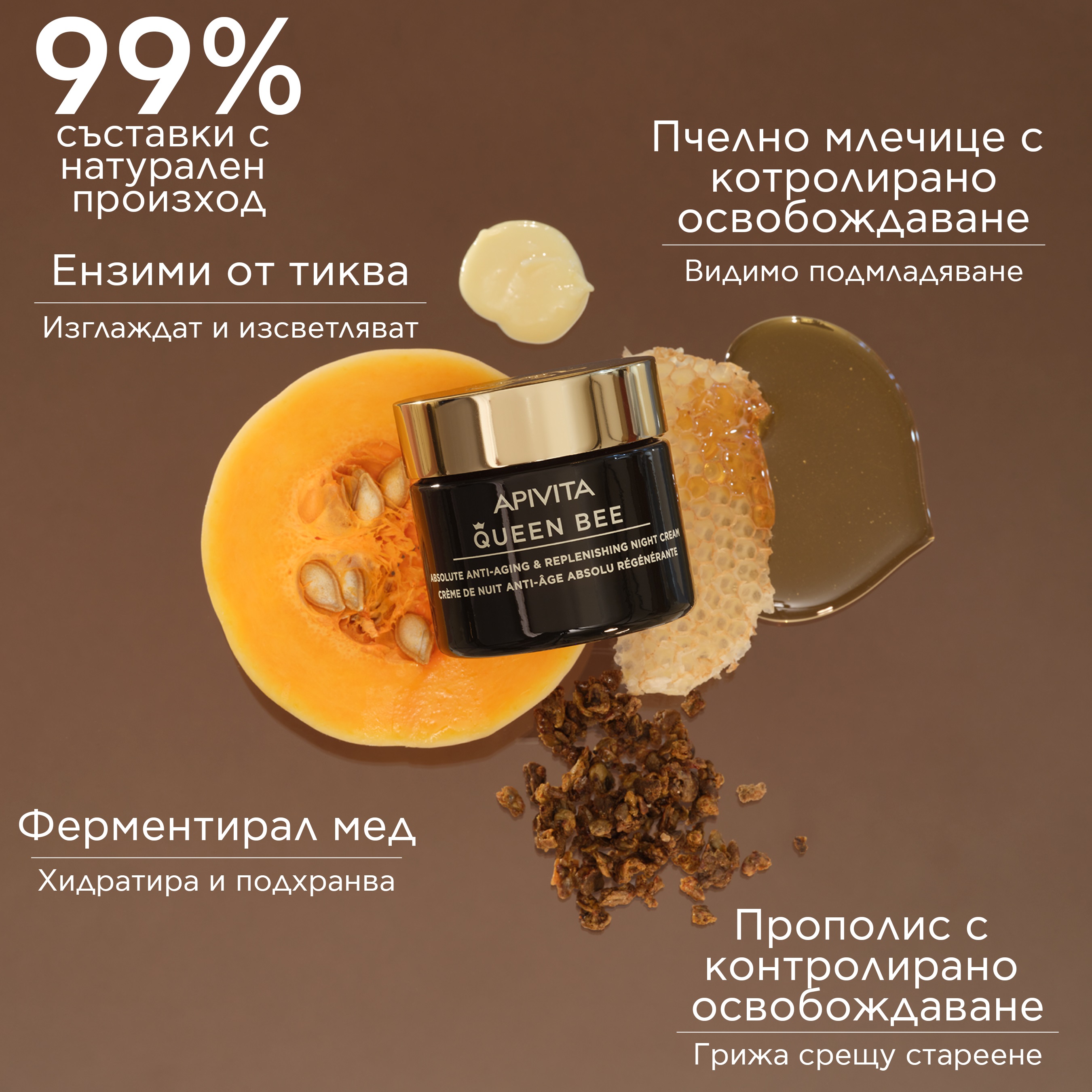 Този подхранващ нощен крем е формулиран с две патентовани технологии за контролирано освобождаване, които предлагат на кожата силно концентрирана, непрекъсната и дълготрайна дифузия на пчелно млечице и прополис, които коригират бръчките, уплътняват и стягат кожата и извайват контура на лицето. Кремът стимулира клетъчното обновяване чрез нежна ексфолиация, за гладка кожа с изравнен тен, благодарение на ензими от тиква. Детоксикира, хидратира и подсилва естествената защита на кожата срещу агресивни фактори, с API-HONEY извлек, сквалан, масло от маслина, пчелен восък и пантенол. Морските екстракти предотвратяват появата на пигментни петна, озаряват и изравняват тена. 99% Натурален произход. Дерматологично тестван продукт.