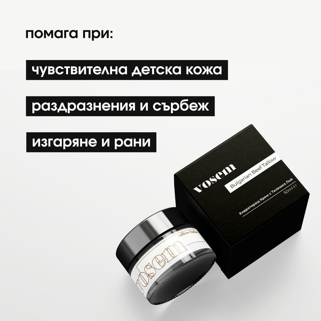 Създадохме нашия крем от телешка лой като дълбоко подхранващо и универсално решение за грижа за кожата, което съчетава силата на естествените съставки за хидратиране, защита и възстановяване на кожата.Сместта от телешка лой, зехтин и бадемово масло осигурява интензивна хидратация и подпомага еластичността на кожата, а пчелният восък създава защитна бариера, която задържа влагата. Заедно тези съставки създават продукт, който не само успокоява, овлажнява и връща обема на кожата, но и подобрява естествената ѝ способност да се лекува и защитава, което води до здрава и сияйна кожа. Произведено ексклузивно с лой от пасищно отглеждани телета във ферма за български Блек Ангъс.