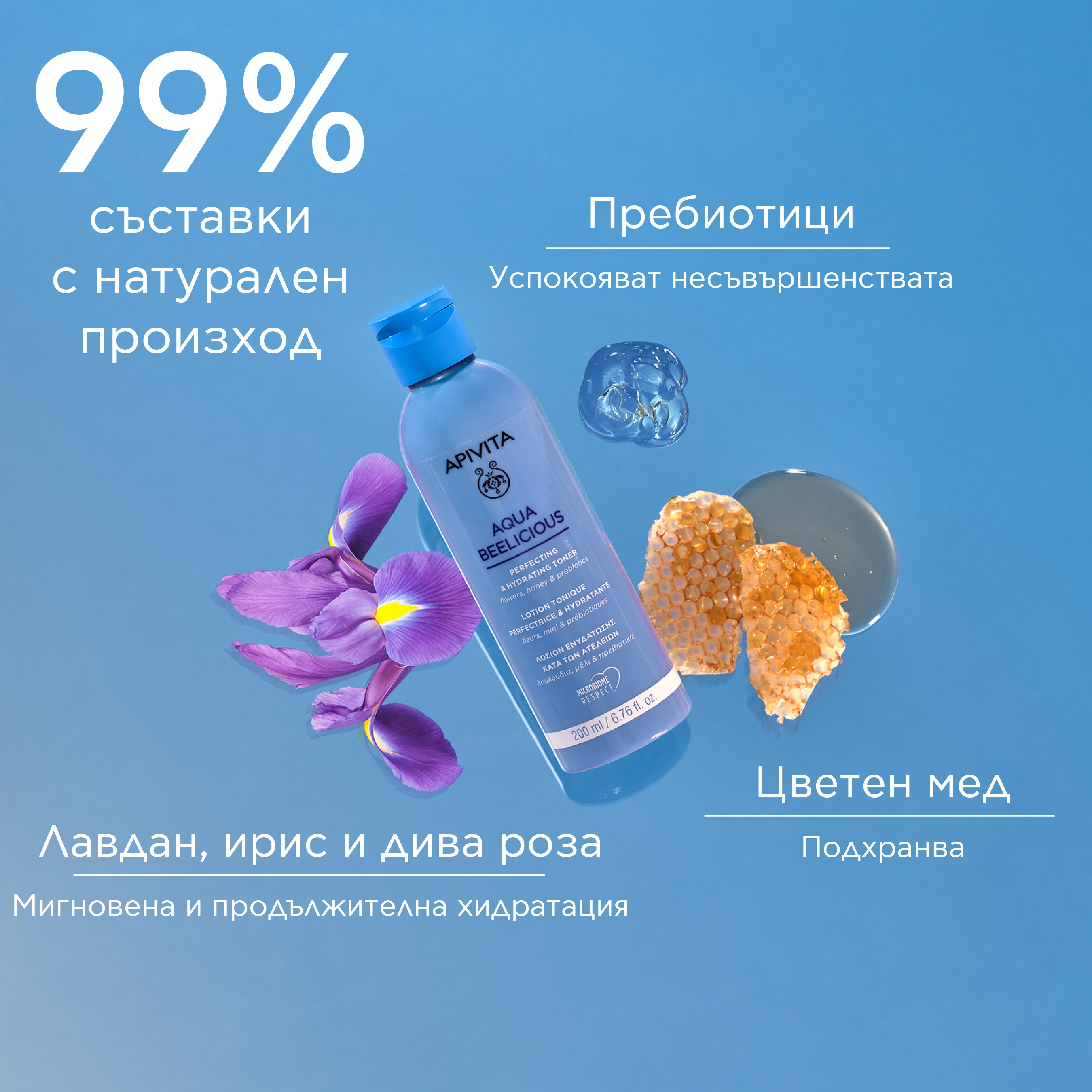 Хидратиращ тоник против несъвършенства с пребиотици, цветя и мед.