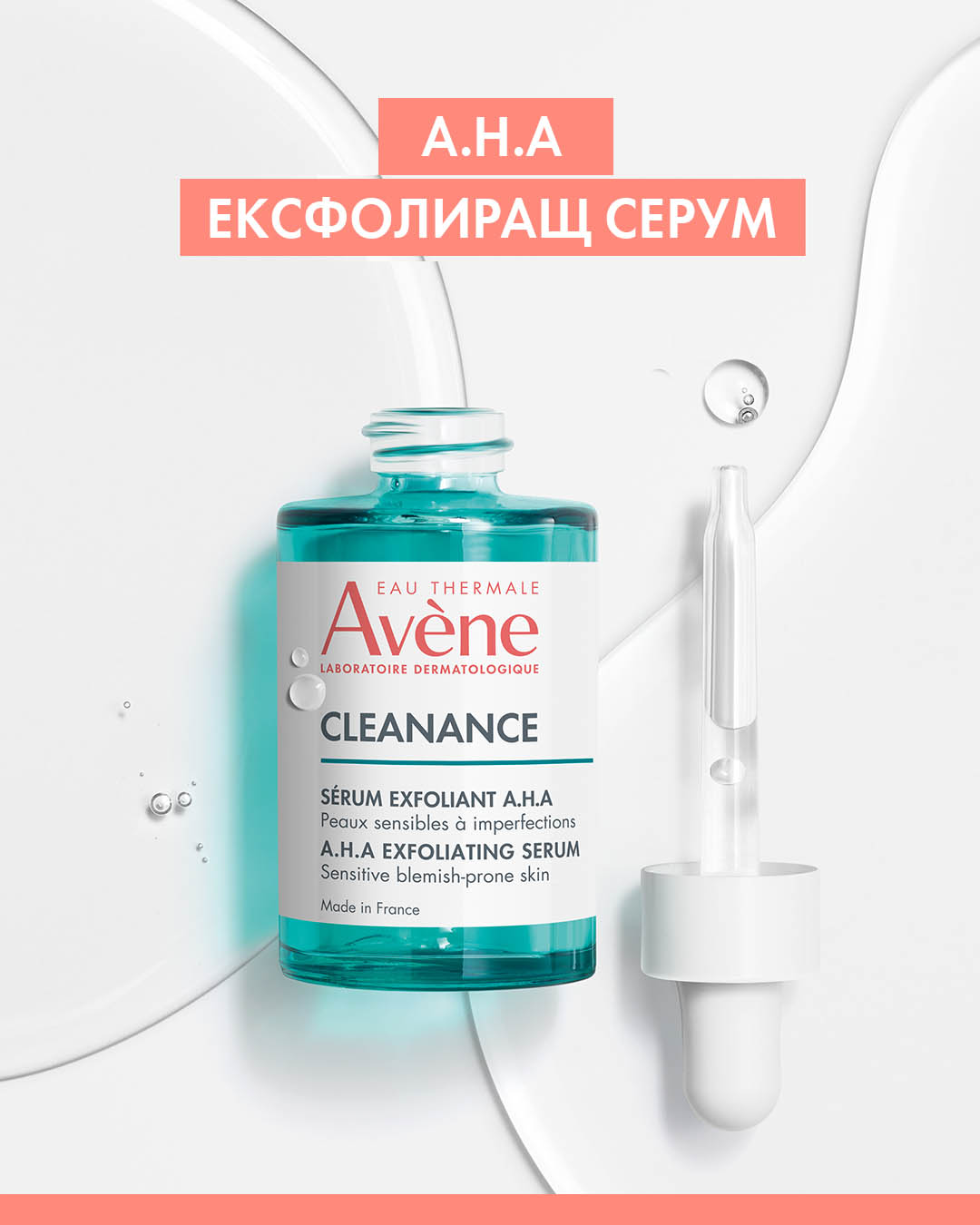 Ексфолиращият серум с патентовани натурални киселини¹ 1,5 пъти по-ефективен² от салициловата киселина, за подобрена текстура на кожата след 10 дни³. Ексклузивният патентован дуо комплекс от млечна (A.H.A- алфа-хидрокси киселина) и сукцинова киселина помага за намаляване на несъвършенствата, порите и белезите. Глутаминовата киселина осигурява регулиращо себума действие за намаляване на излишния себум. Формулата му е обогатена с Термална вода Avène, която успокоява, укрепва и възстановява баланса на кожата. Предназначен за чувствителна кожа и тестван върху склонна към акне кожа, Ексфолиращият серум A.H.А съдържа само 10 съставки и 99% съставки с натурален произход. *Тест eх-vivo, модел върху експлант, сравняващ действието на млечна + сукцинова киселина спрямо салицилова киселина в сравними концентрации върху твърдостта на роговия слой **Тест в реални условия – 74 участници – сутрешно и/или вечерно приложение. *** Заявен патент.