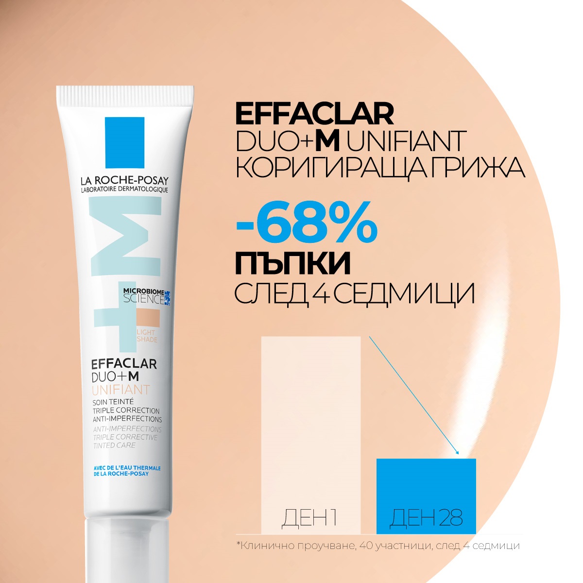 Всички ефикасни свойства на EFFACLAR DUO (+) против несъвършенства, заедно с оцветена текстура за незабавно изравняване на тена