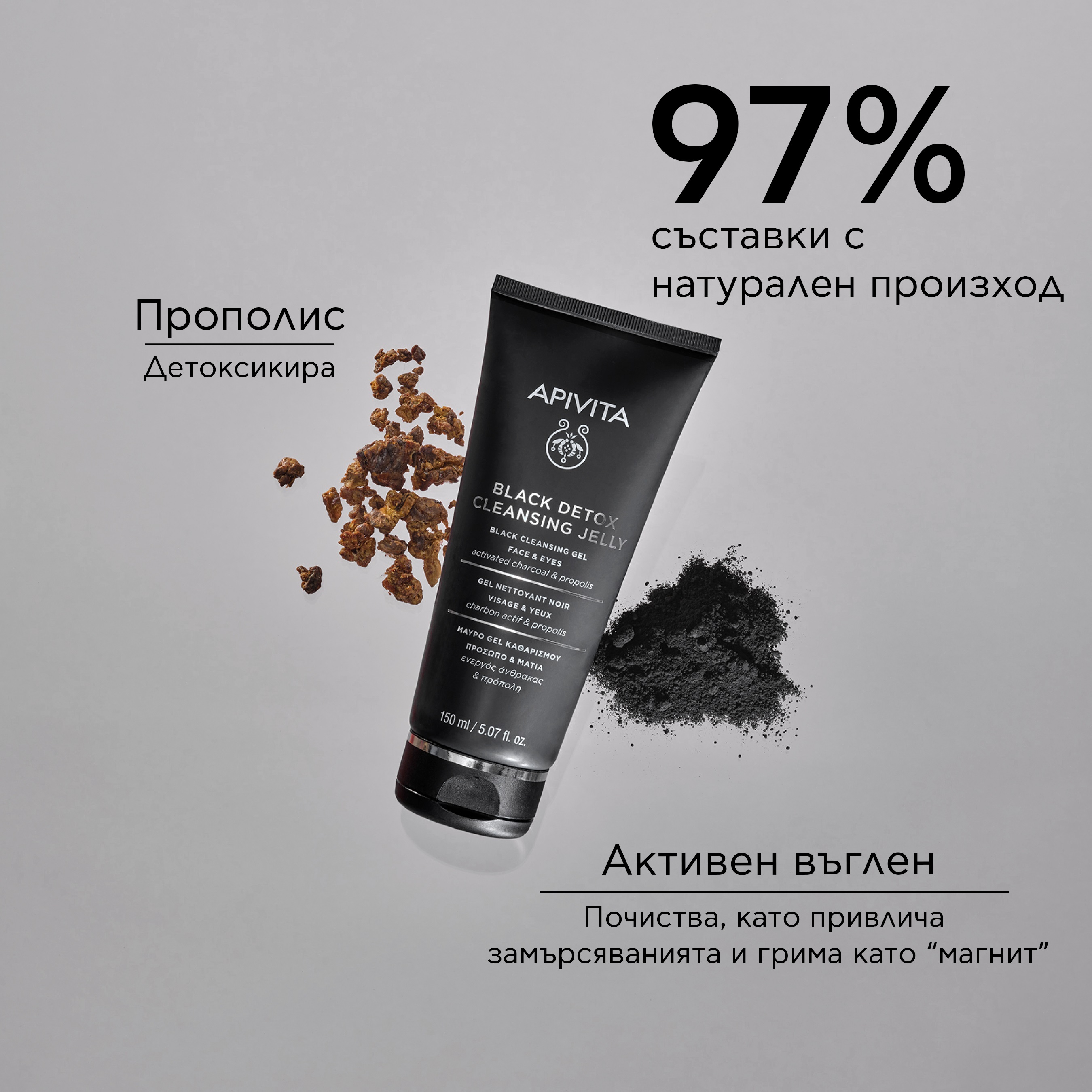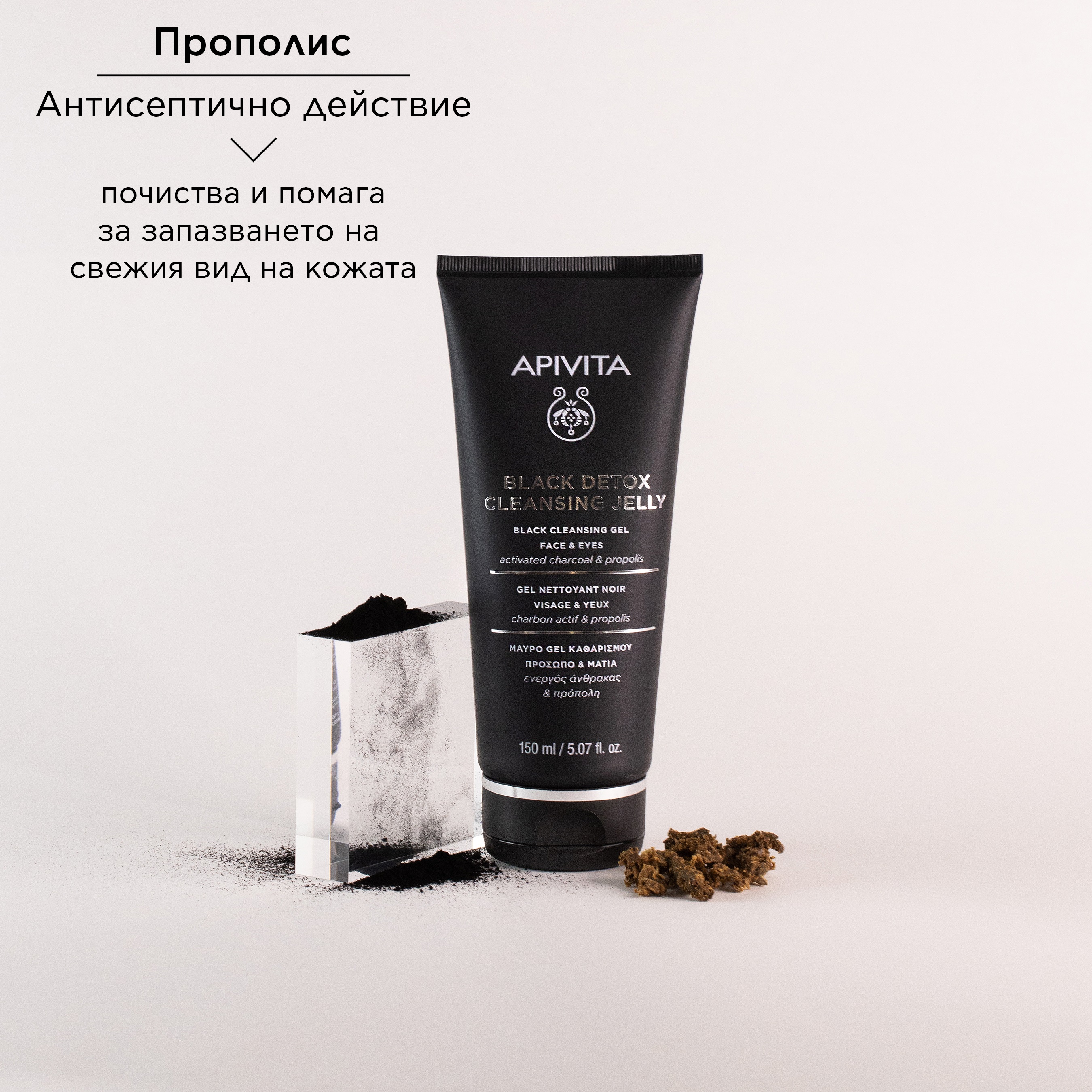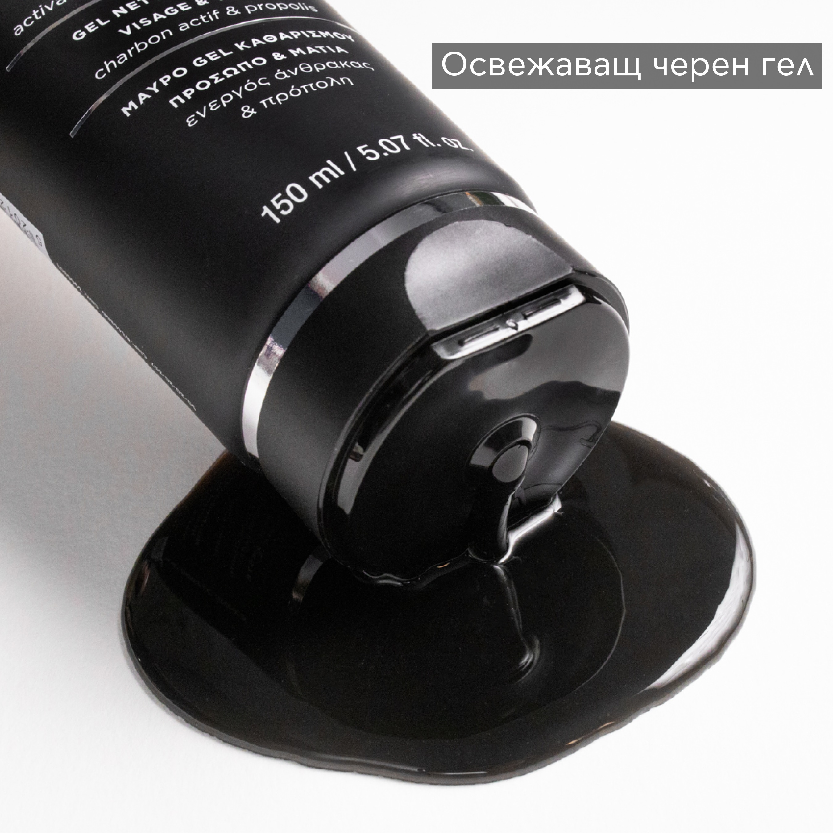 Черният детоксикиращ почистващ гел с активен въглен и прополис ефикасно почиства лицето и зоната около очите, без да причинява раздразнение и сухота.