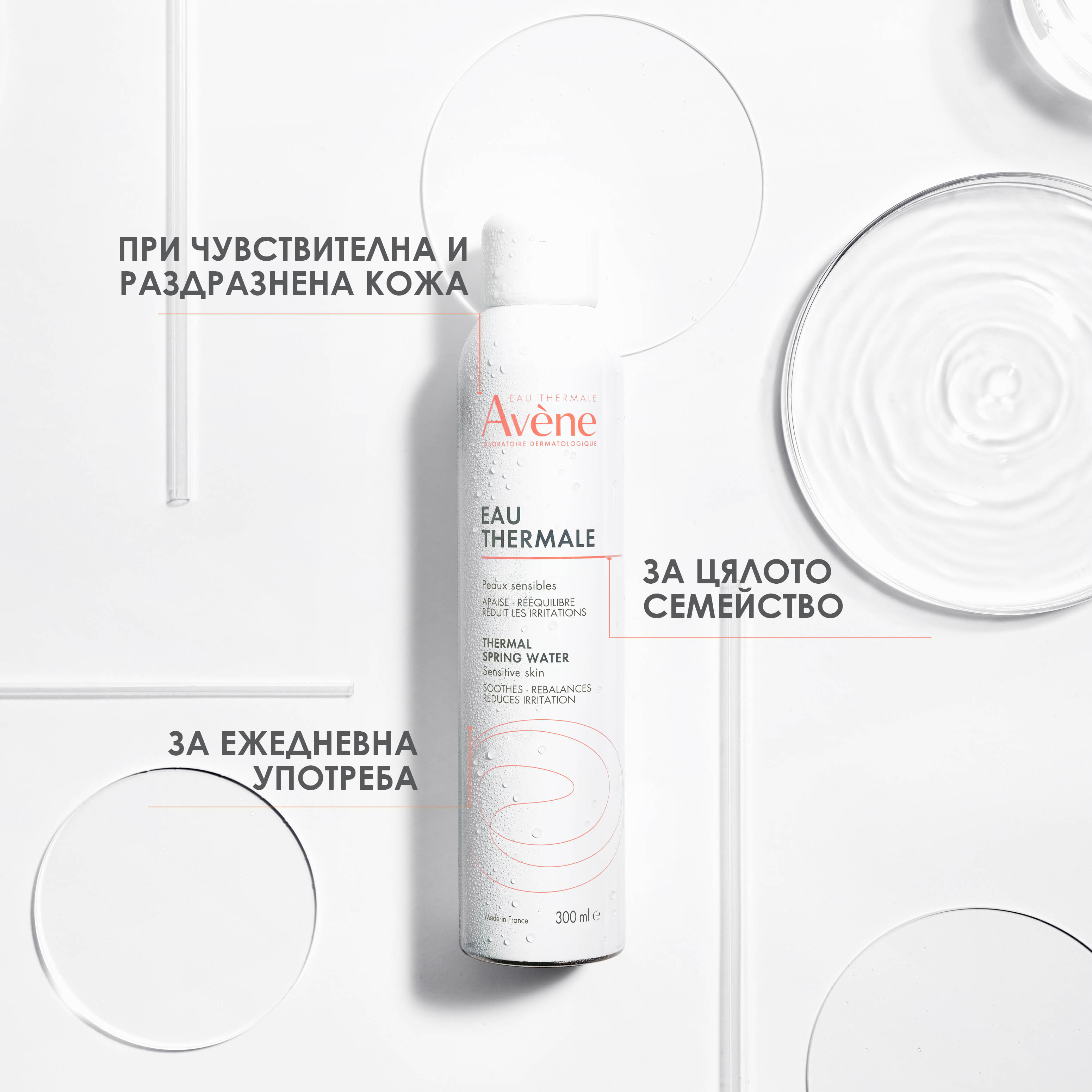 Спреят с термална изворна вода Avène успокоява, укрепва и възстановява баланса на чувствителната или раздразнена кожа, която показва признаци на дискомфорт, зачервяване, сърбеж и стягане. Спреят с термална вода може да се използва ежедневно след почистване на лицето. Термалната вода подготвя кожата и улеснява нанасянето на основната грижа, когато се прилага преди продукти като крем, серум, флуид. С незабавен ефект против изсушаване, спреят с термална изворна вода може да се използва от цялото семейство за успокоена, подсилена и здрава кожа.