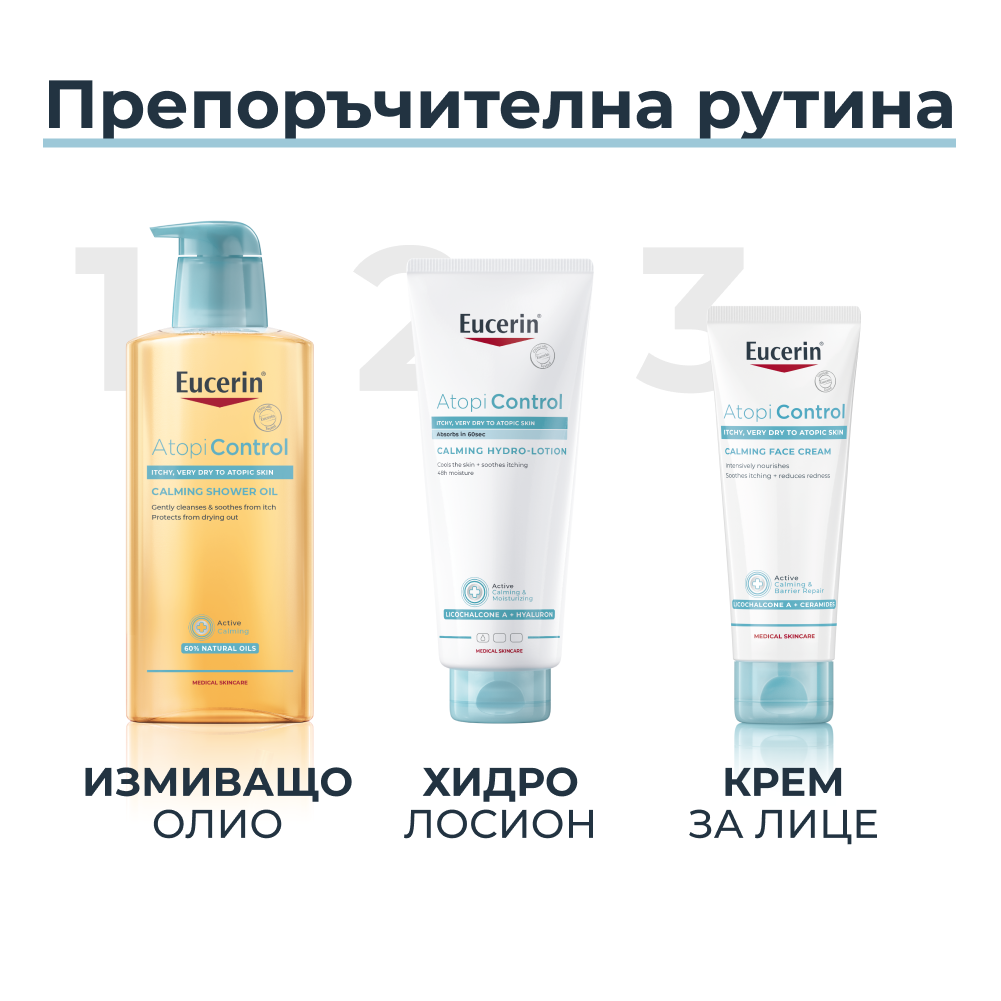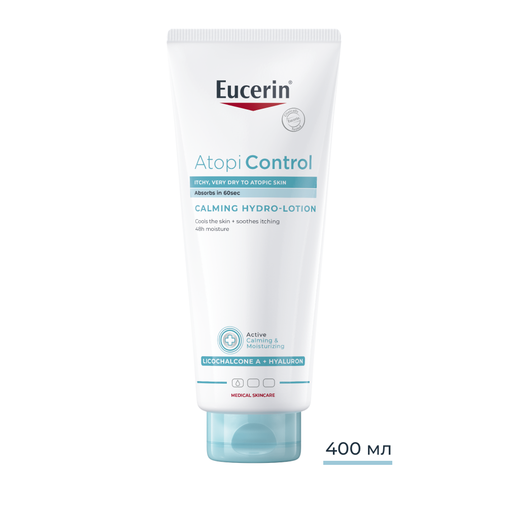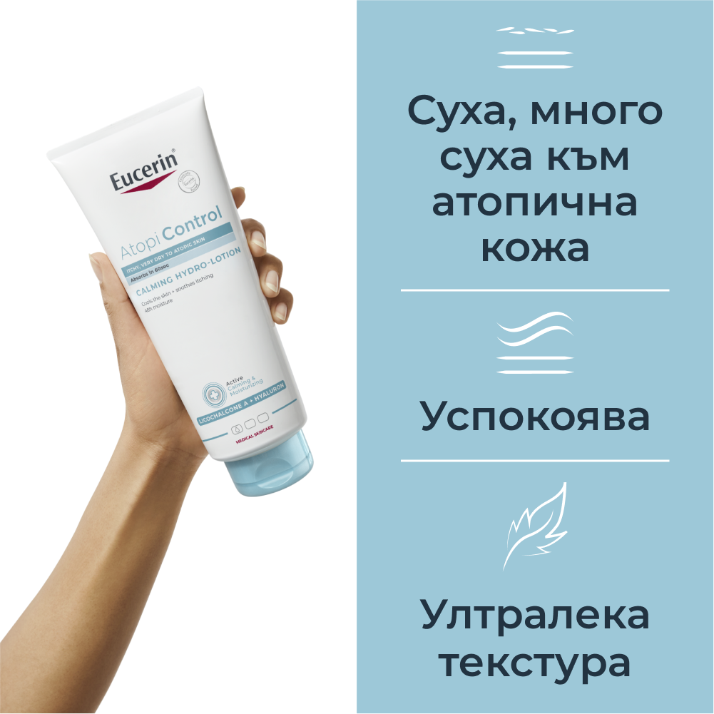 Успокояващият хидро-лосион Eucerin AtopiControl е предназначен за сърбяща, много суха до атопична кожа. Попива за 60 секунди, охлажда кожата и успокоява сърбенето като осигурява 48 часа хидратация.