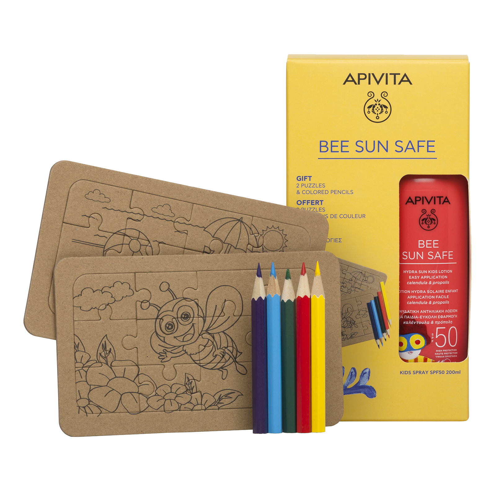 APIVITA Слънцезащитен спрей за деца SPF50 + ПОДАРЪК 2бр. Крафт пъзел с цветни моливчета