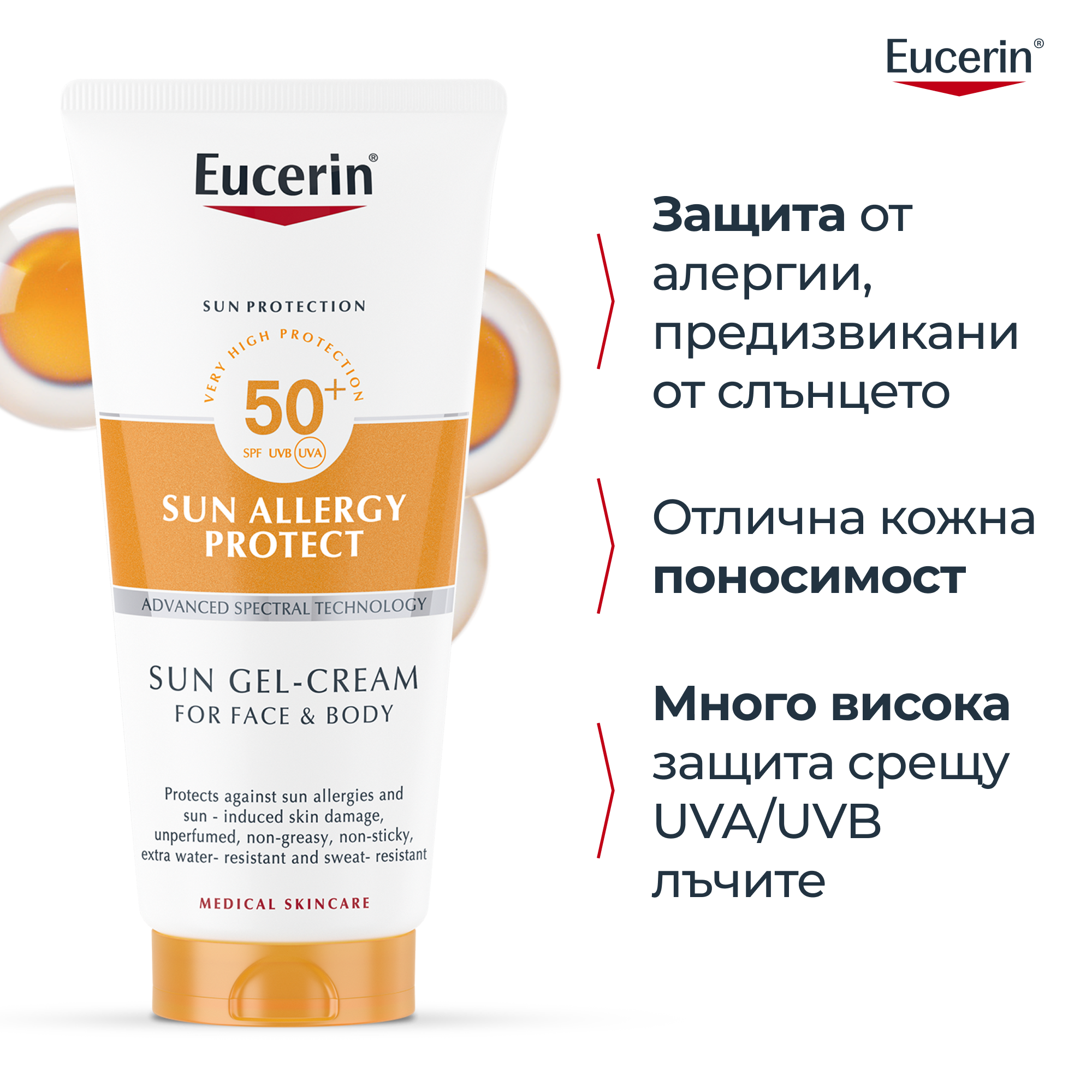 Eucerin® иновация в слънцезащитата: ADVANCED SPECTRAL TECHNOLOGY комбинира UVA/B филтри за много висока UV защита и Ликохалкон А, които съдействат за неутрализация на свободните радикали от UV и високоенергийната видима светлина. Глицеритиновата киселина подпомага маханизмът на възстановяването на ДНК на кожата. AGR (Alpha-Glucosyl-Rutin) – спомага за предпазване от слънчеви алергии като полиморфна светлинна ерупция (PLE).