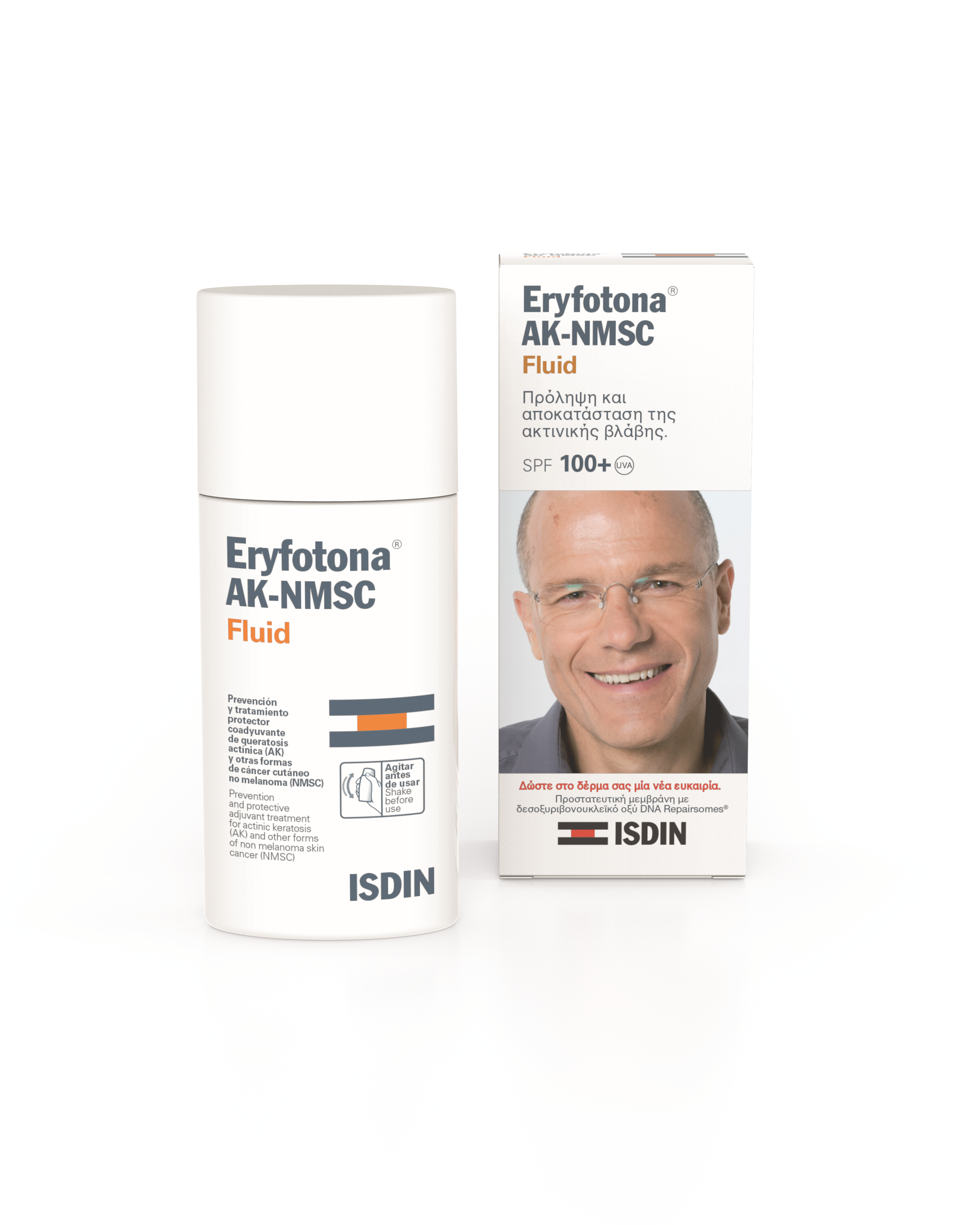 Показания: Eryfotona® AK-NMSC е предназначен за превантивно и предпазно адювантно лечение на актинична кератоза (АК) и други форми на немеланомен кожен карцином (НМКК) на хора, при които съществува риск от развитие на АК или други форми на НМКК, като: фенотип I и II, или лица, които са имали или са в процес на лечение за АК или други форми на НМКК. Намалява и подобрява полето на субклинична кожна канцеризация, свързано с актинична кератоза (АК) и други форми на немеланомен кожен карцином (НМКК) Образува защитен филм с Repairsomes® по кожата, който съдържа фотолиаза, капсулирана в липозоми и UV филтри (SPF 109, UVA in-vitro 39), която абсорбира, отразява и разпръсква слънчевата радиация. Водоустойчив продукт.