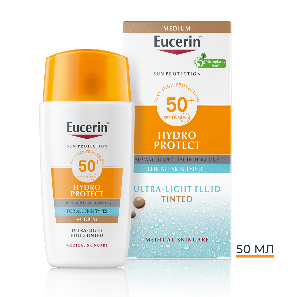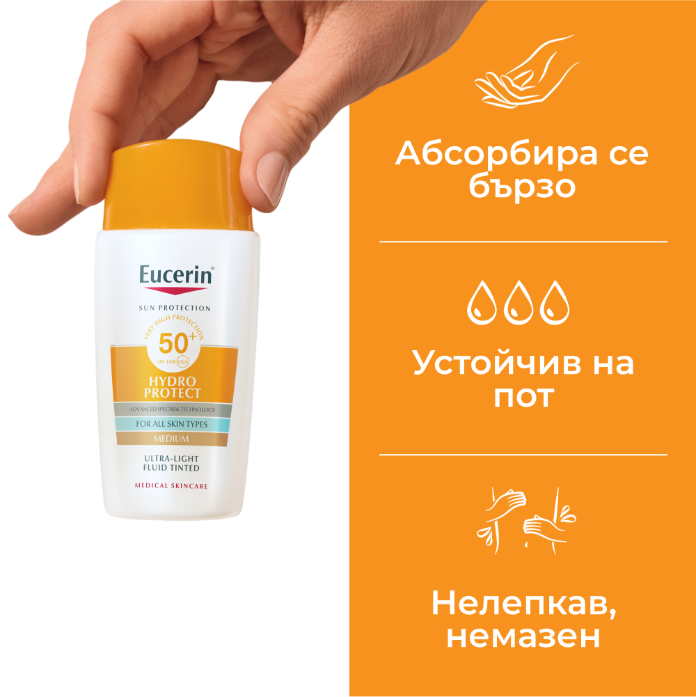 EUCERIN SUN SPF50+ Hydro Protect Оцветен слънцезащитен ултралек флуид за лице светъл 50ml