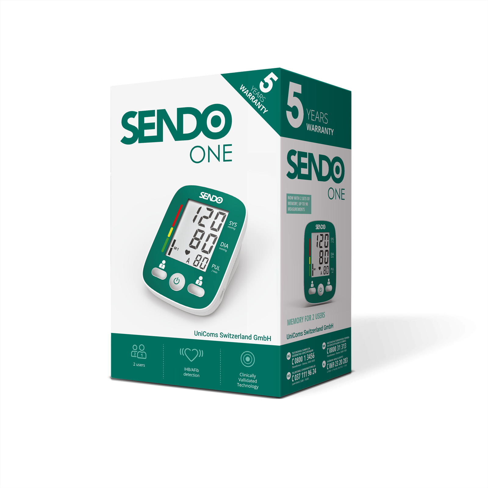 SENDO One е новото попълнение в автоматичните дигитални апарати за кръвно налягане SENDO. Измерва с клинична точност в домашни условия и разполага с памет за двама души, съхранявайки до 90 измервания на човек. Използва се лесно, върху бицепса на ръката и с натискане на един бутон.