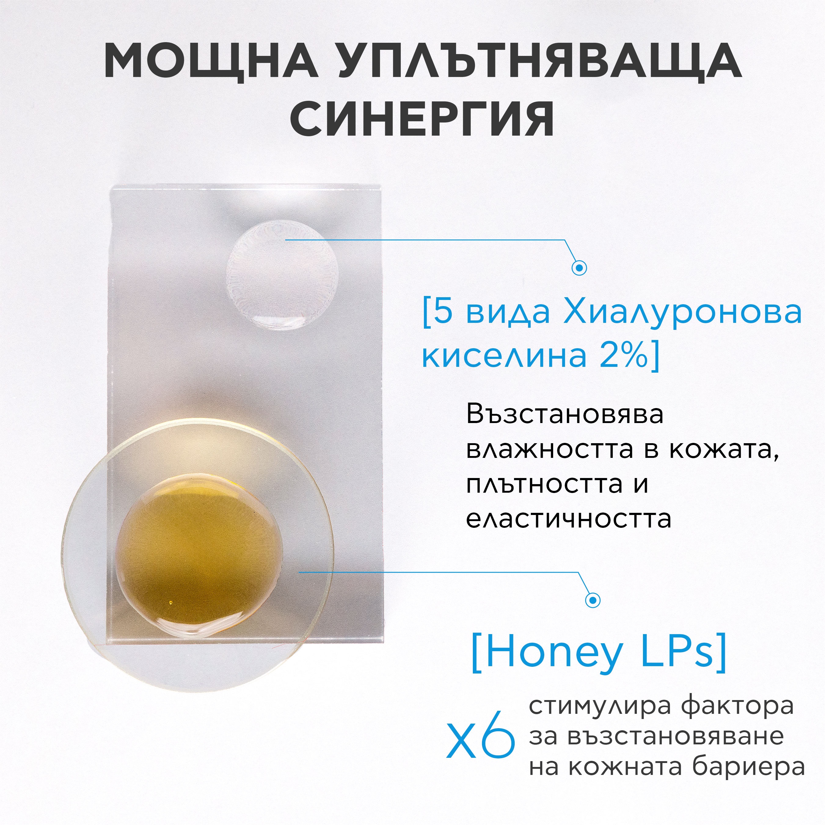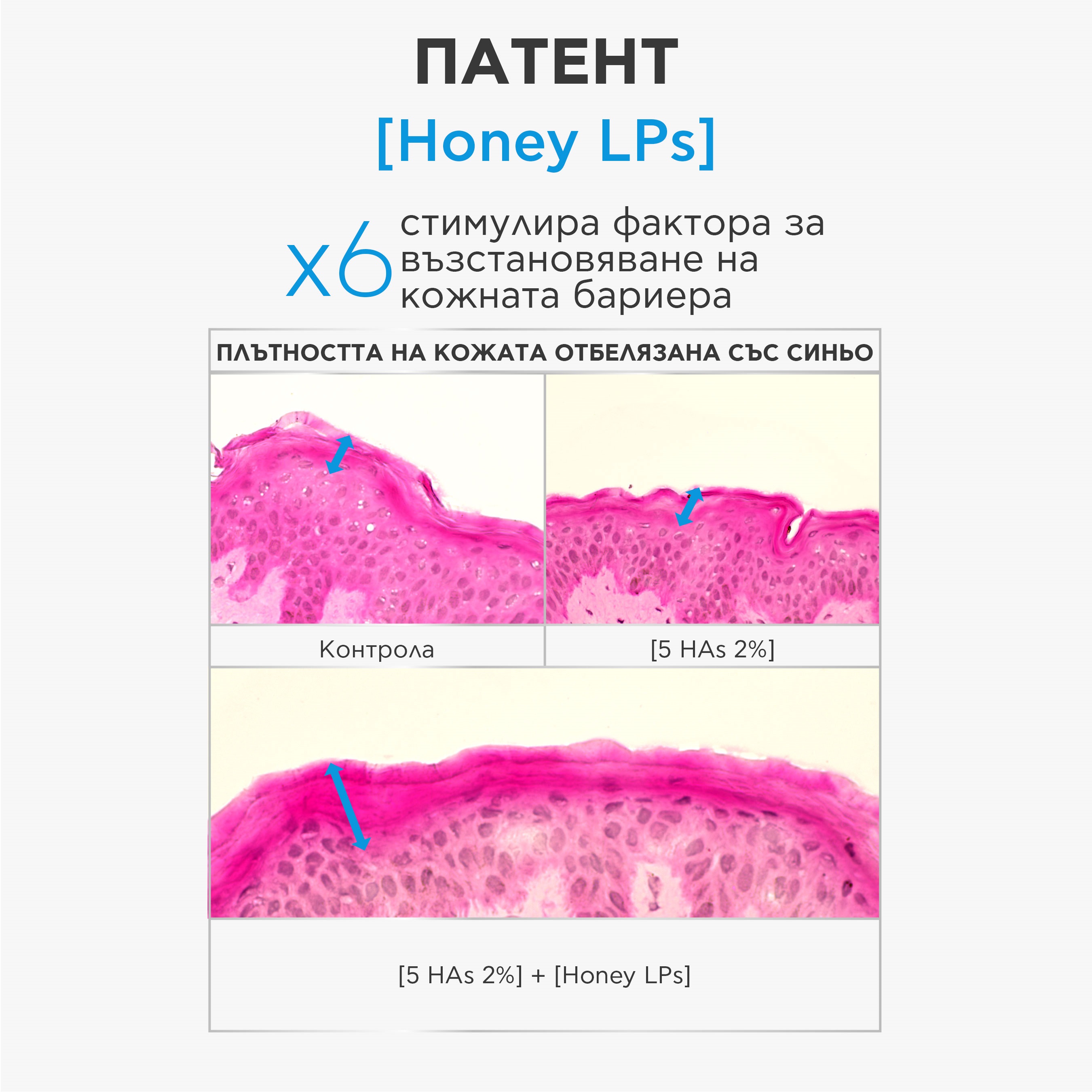 HA5 Honey Repair Serum uses the powerful synergistic plumping power of Hyaluronic Acid and Honey to visibly reduce wrinkles and plump the skin. It contains a wide range of Hyaluronic Acids with 5 different molecular weights in a 2% concentration that nourish the skin. In addition, the serum is enhanced with the exclusive Honey LPs technology, encapsulating the healing molecules of honey in liposomes for even better penetration into the skin. It is proven to increase the production of barrier protection factor 1, which helps the skin repair process and retain optimal amounts of moisture.
