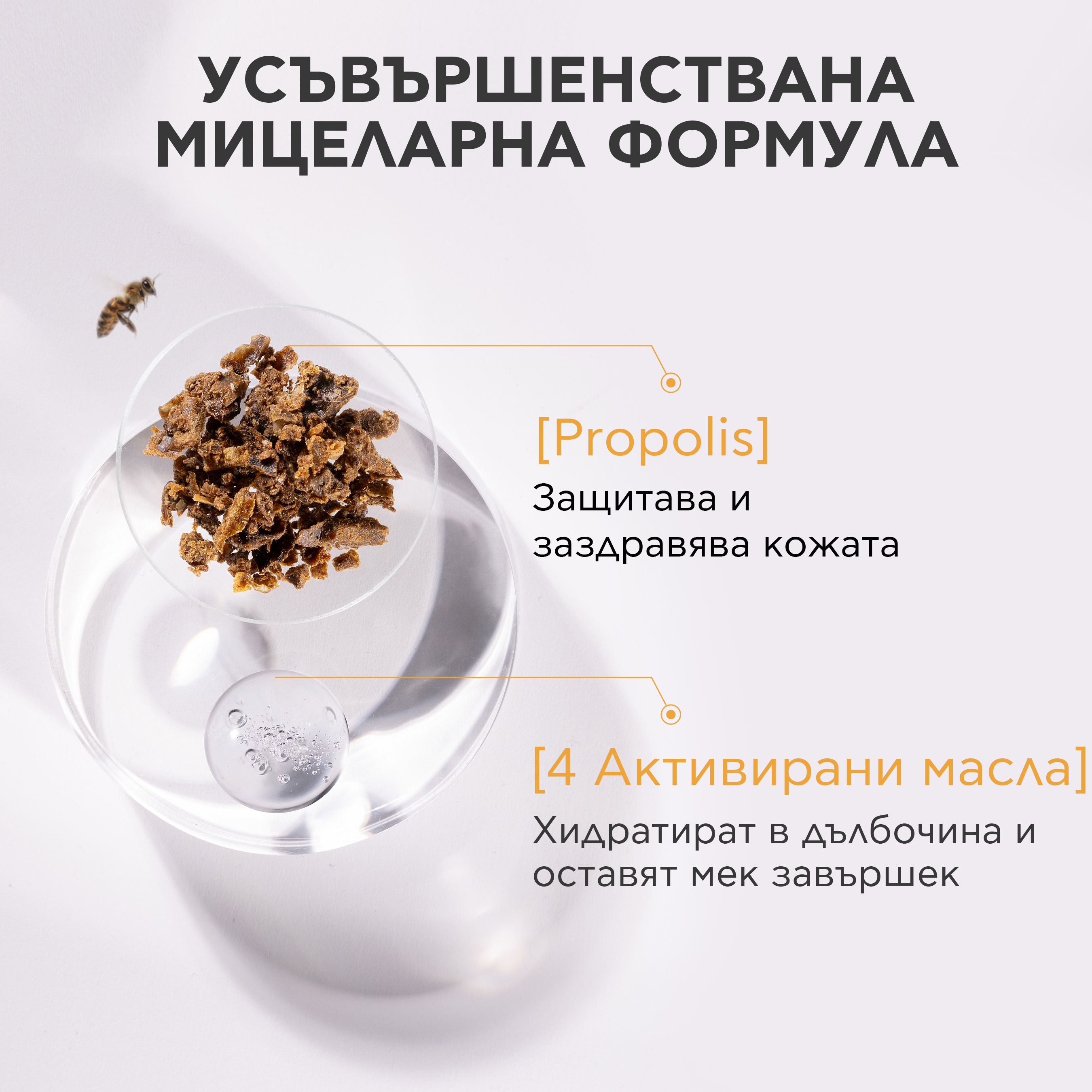 Propolis helps protect the skin from external aggressors, and the combination of four active oils – olive, almond, linseed and borage, provides deep hydration and silky softness. The delicate aroma pampers the senses, turning cleansing into a real ritual.